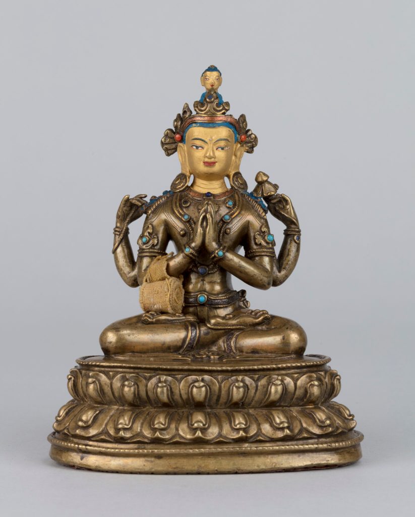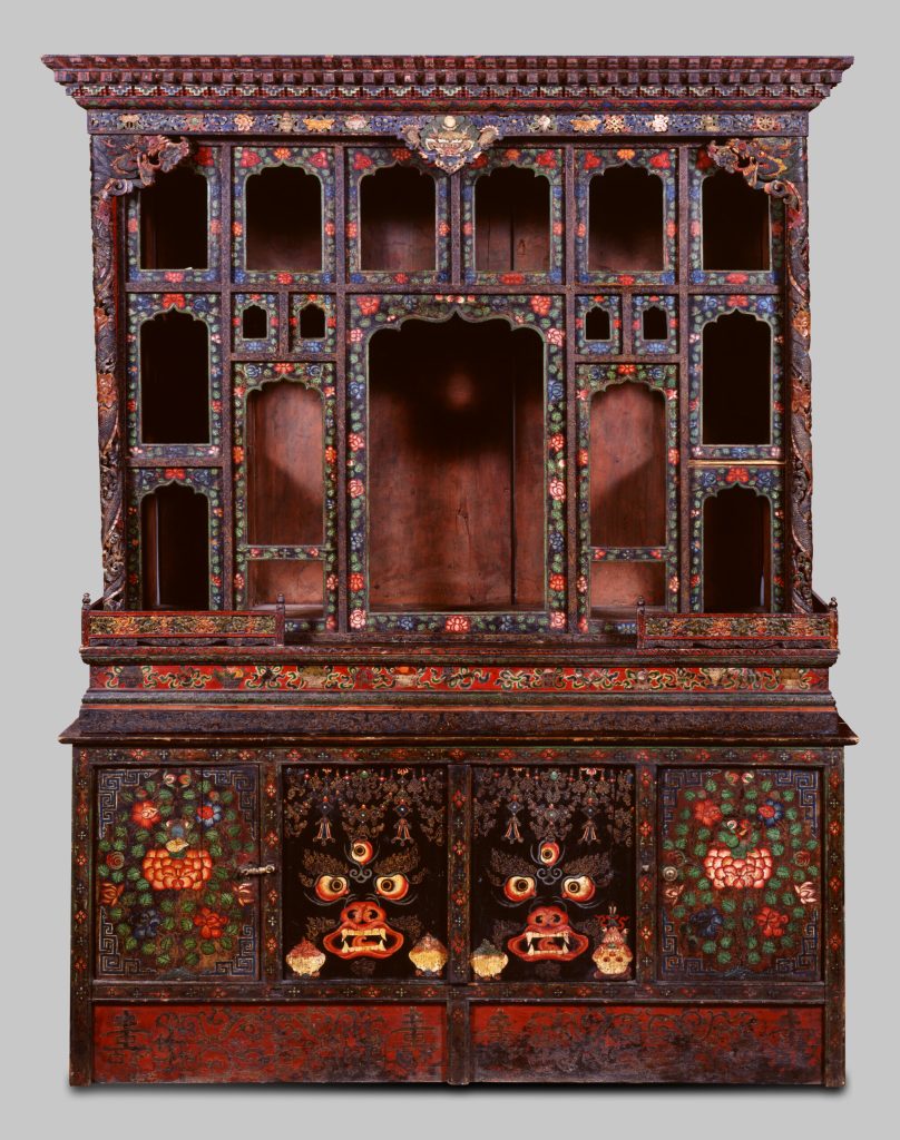 From the top left: Shrine Cabinet (Chosham) (Tibet, second half of the 20th century), wood, mineral pigments © Rubin Museum of Art; Left corner close up of Shrine Cabinet (Chosham) (Tibet, second half of the 20th Century), wood, mineral pigments © Rubin Museum of Art; Four-armed Avalokiteshvara (Tibet, 16th century), copper alloy with mineral pigments, semiprecious stones, cloth © Rubin Museum of Art; Photo courtesy of Rachel Chamberlain of the immersive McMullen 3rd floor gallery installation of a Tibetan shrine cabinet.